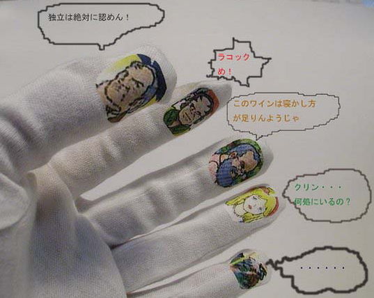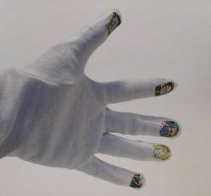 えー、いつも楽しい作品をありがとうございます。これはアイロンプリントを使っているとのことですが、指先とか洗濯のときに「ペリッ」と剥がれて無くなってしまいそうで怖いですね。剥がれるだけならもう一回アイロンし直せばまたくっつくようですが、どっかいっちゃったらどうしようもないからねえ。