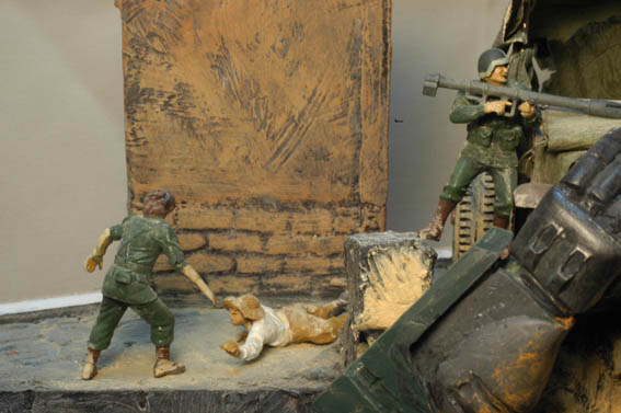 人形はタミヤのMMを改造し治安軍兵士と民間人を製作。車両はデロイヤ製を意識して、後輪を大型化しXネブラ下でも元気に走れそうな感じを表現しました。