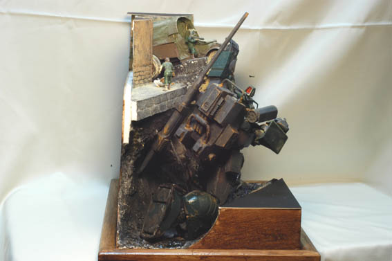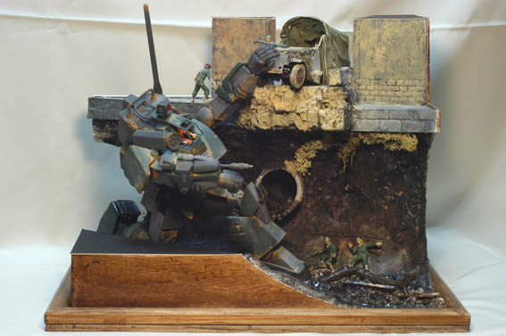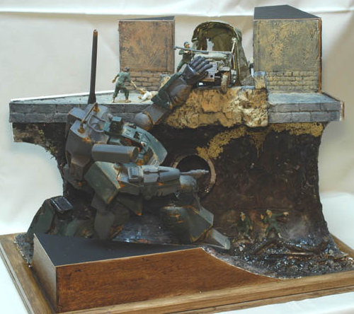 地球寄りのテログループ等と戦う『デロイヤ独立戦争』後の治安軍です。そのため制服等は連邦軍のままです。サマリン博士の助手をメインスタッフに、レプリカを作ったという設定。(量産型ではない。)民間の車両は軍の払い下げを使用しているって感じ。ダグラム・レプリカもかなりくたびれてる感を表現しました。(8軍ではなくなった為、技術者が不足している。)片側の肩の装甲もこの戦闘でドブ川に落ちちゃってます。