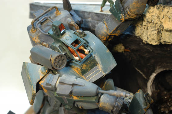 も〜精度のかけらもありません。 関節は瞬間接着剤で固定後ティッシュをアクリル絵の具で浸したもで巻きました。腕の装甲、キャノピーのフレームはプラ板で。リニアガンの砲身は、デザインの現場でも使わなくなったペーパーセメント用シンナーディスペンサーの口を使用。"くたびれてる感"を出す為、アップリケアーマーを部分的に貼付。破損や腐食を表現。ダグラム、コクピット内のモニターは角度的に人を見せる為、取り外しました。キャノピーも撮影時の反射を考え付けませんでした。(スターウォーズのXウイングの如く。)